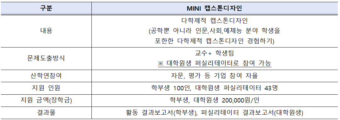 지역혁신중심 대학지원체계(RISE)사업단에서는 「2025년도 확장형 캡스톤디자인(MINI) 지원사업」을 시행하오니, 지원 대상인 캡스톤디자인 수강 학생들의 많은 참여 바랍니다.