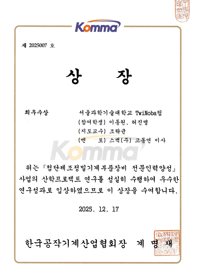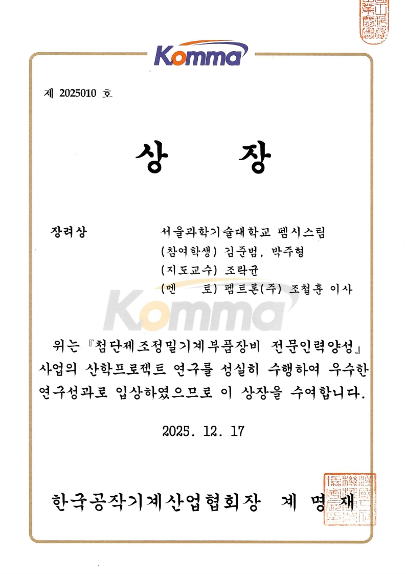 MSDE학과 비선형구조거동평가연구실 석사과정 김준범, 박주형, 이동원, 박사과정 허진명 한국공작기계산업협회 우수 연구성과 수상